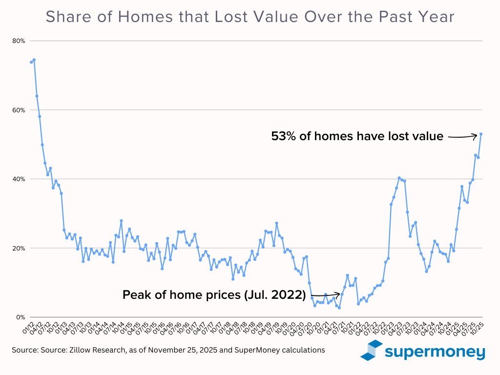 According to new data from Zillow, 53% of U.S. homes have dropped in value over the past 12 months. This marks the highest level of depreciation since the housing recovery began more than a decade ago.