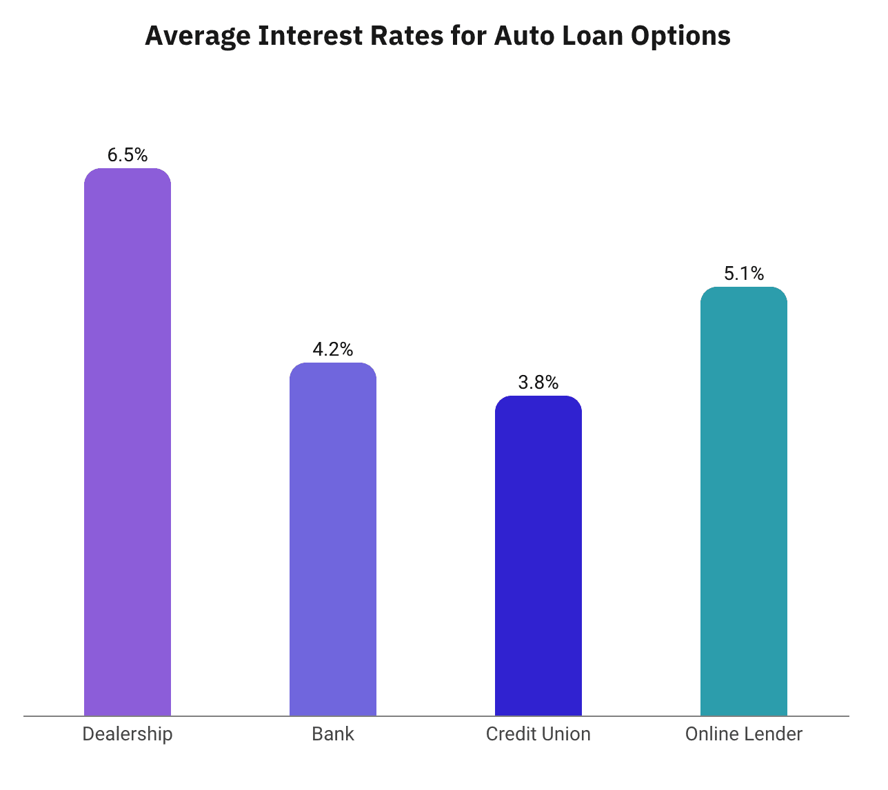 To help you better understand how interest rates differ across financing options, the chart below highlights average rates for dealerships, banks, credit unions, and online lenders.