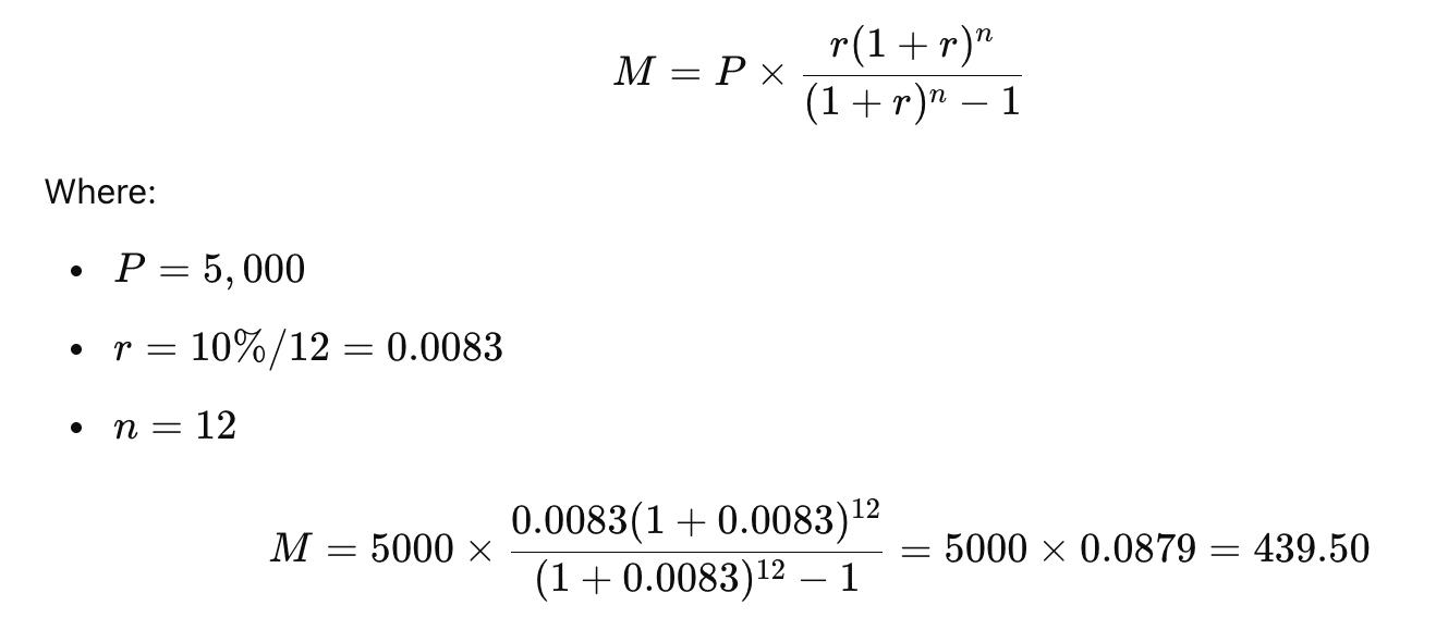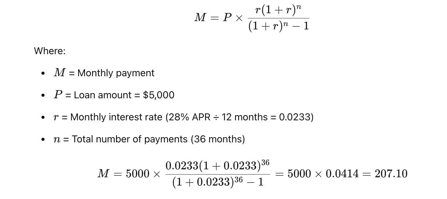 Emily’s monthly payment is approximately $207.10, and over three years, she will repay $7,455.60, which includes $2,455.60 in interest.
