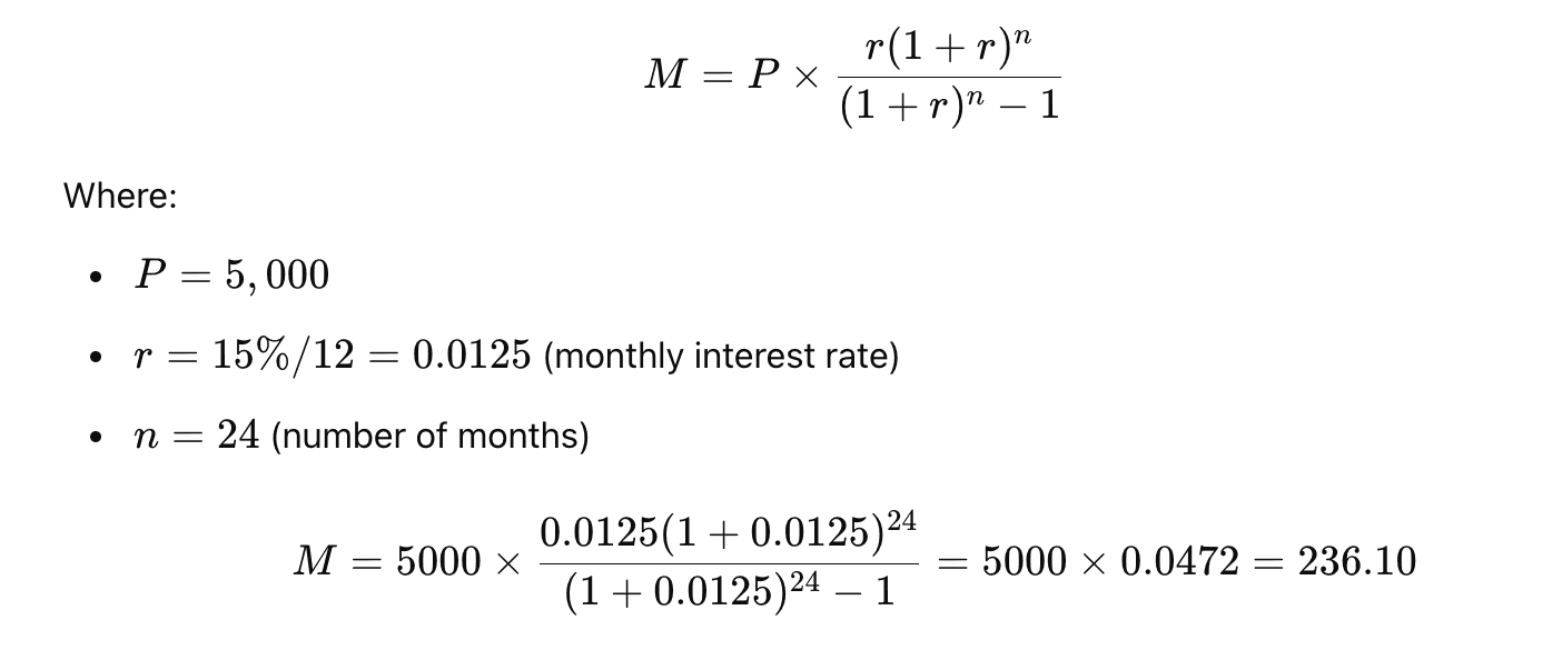 Carlos’ monthly payment is approximately $236.10, and over two years, he will repay $5,666.40, which includes $666.40 in interest.