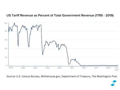 In the early 19th century, tariffs accounted for over 80% of total government revenue, reflecting their crucial role in funding the federal government before the income tax system. The chart reveals sharp fluctuations, likely tied to economic cycles, trade policies, and wars. However, a significant and sustained decline began in the late 19th century, coinciding with industrialization and fiscal policy changes.