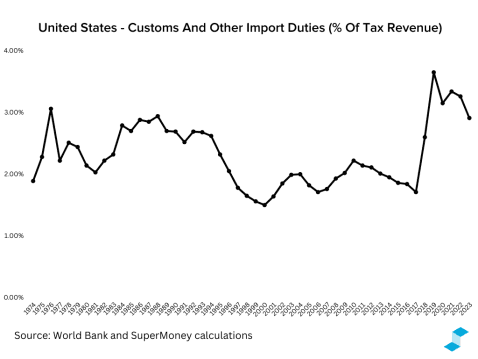 - World Bank data shows customs and import duties fluctuating between 1.5%–3.6% of tax revenue from 1974 to 2023.